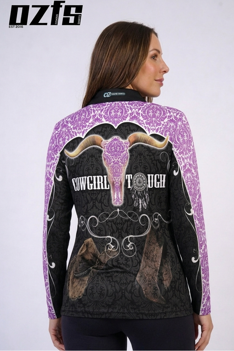 Duo-toned fishing shirts featuring a timeless paisley pattern with black panel embellished with cowgirl inspired motifs and featuring a cow skull for the toughest cowgirl in town. Long sleeves and UV rated fabric make this shirt a must for your wardrobe.